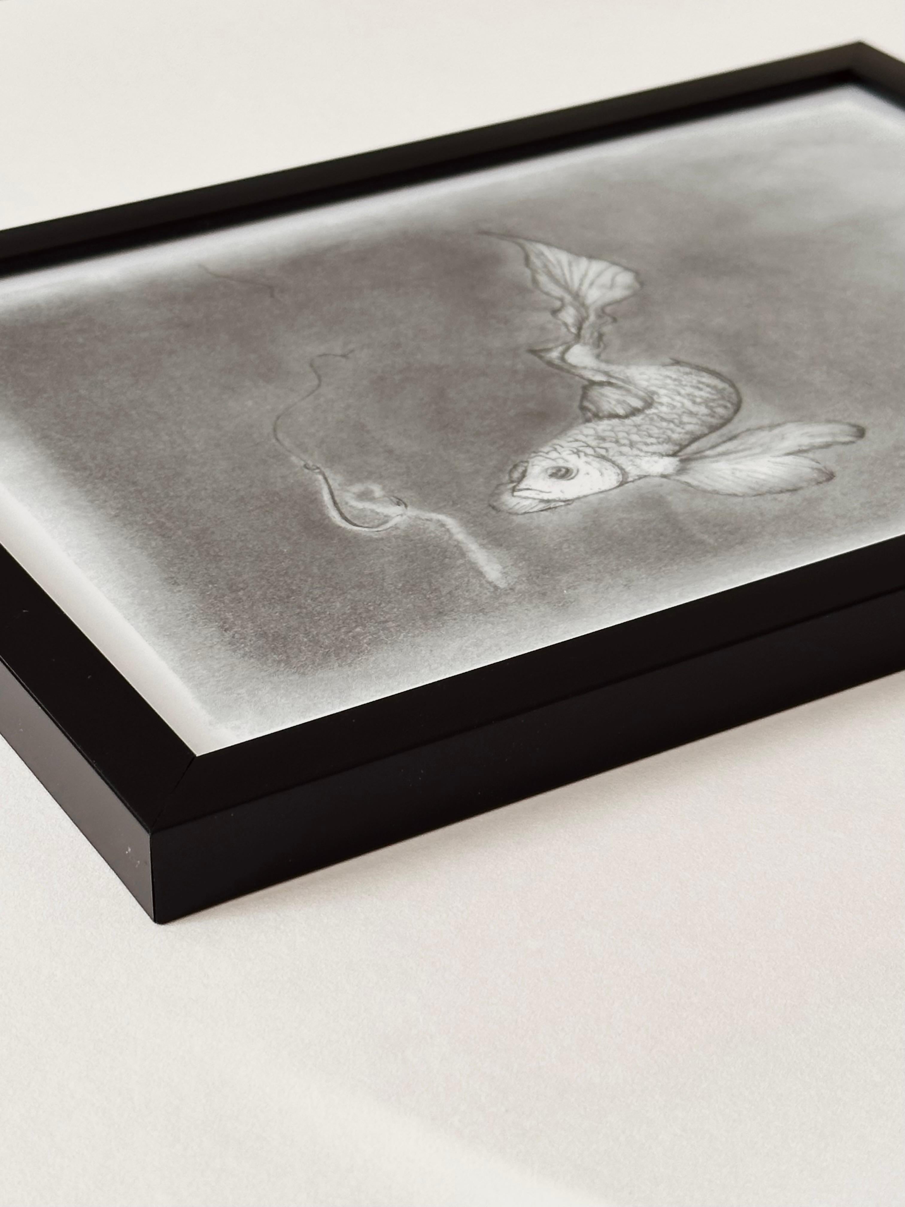 between them, gently floating, the tail fin guiding the fish at a calculated speed.
